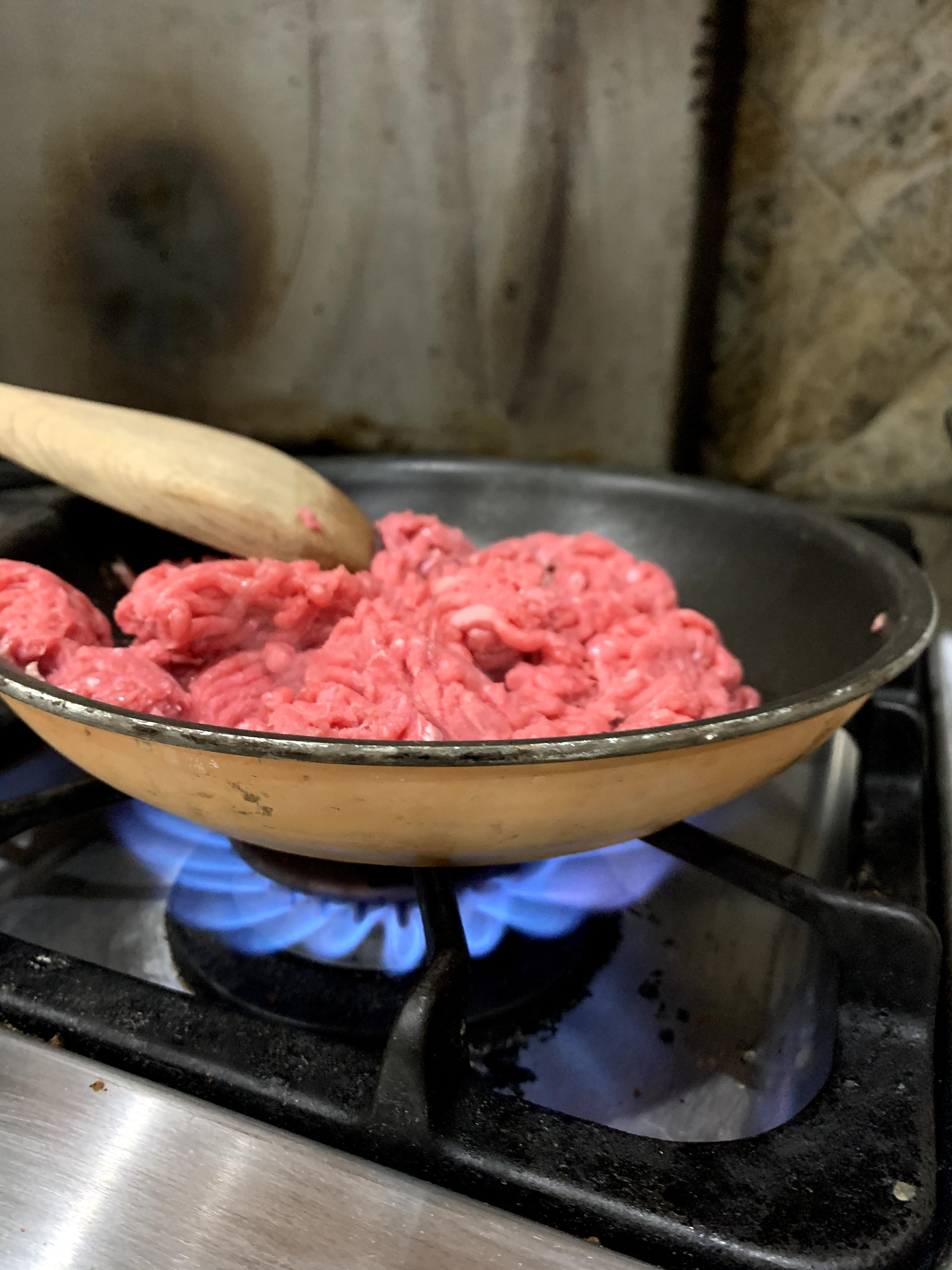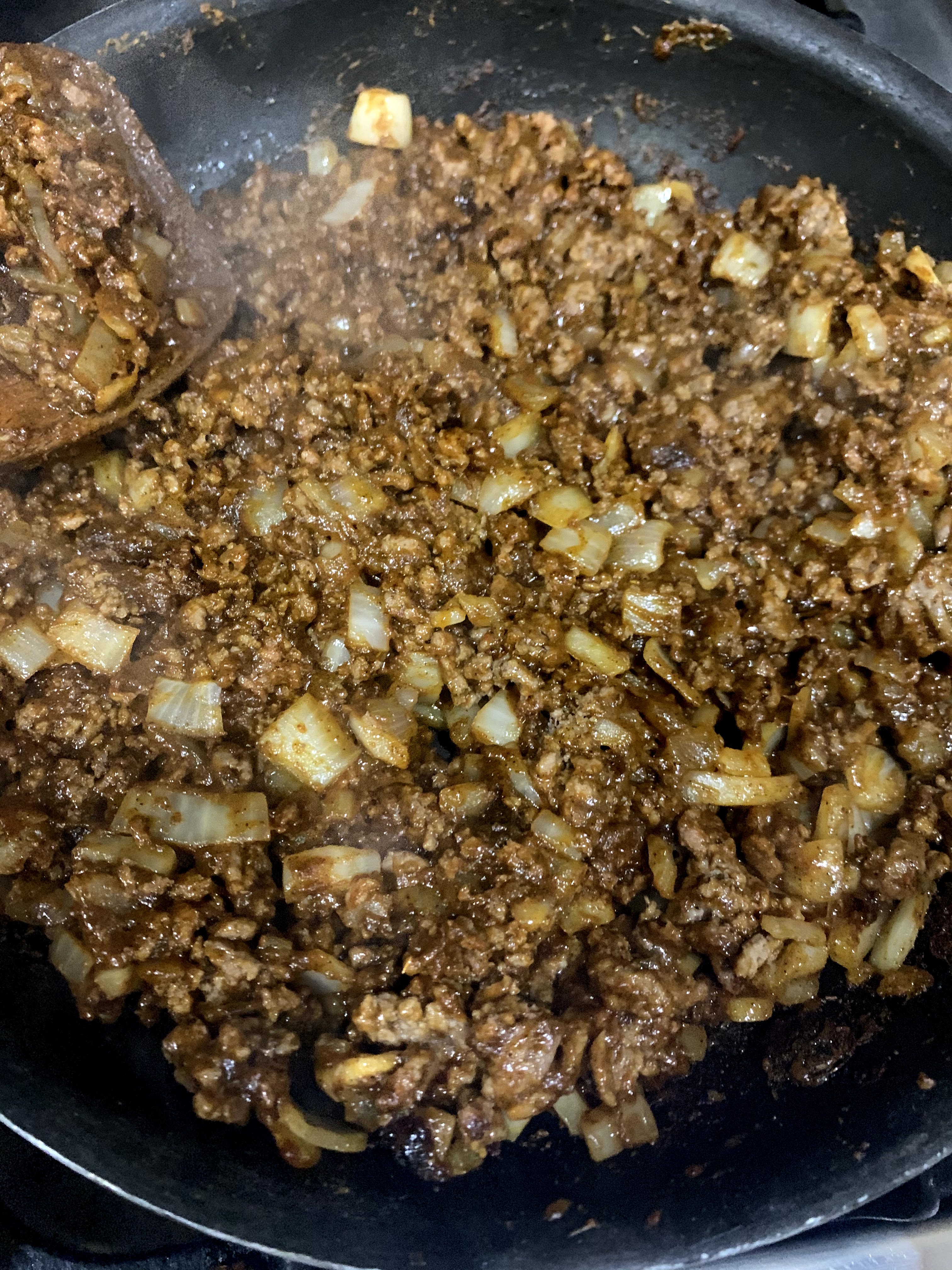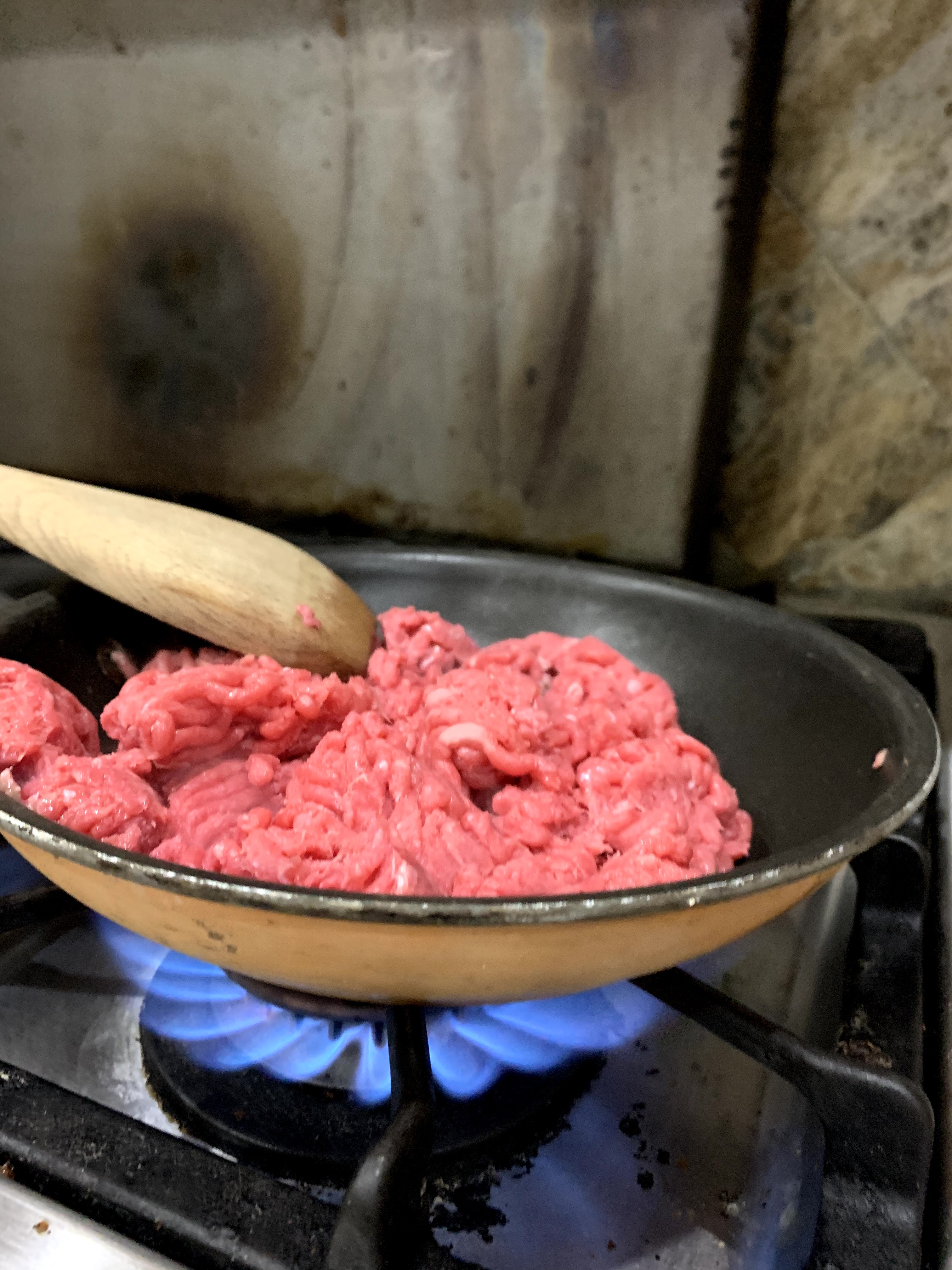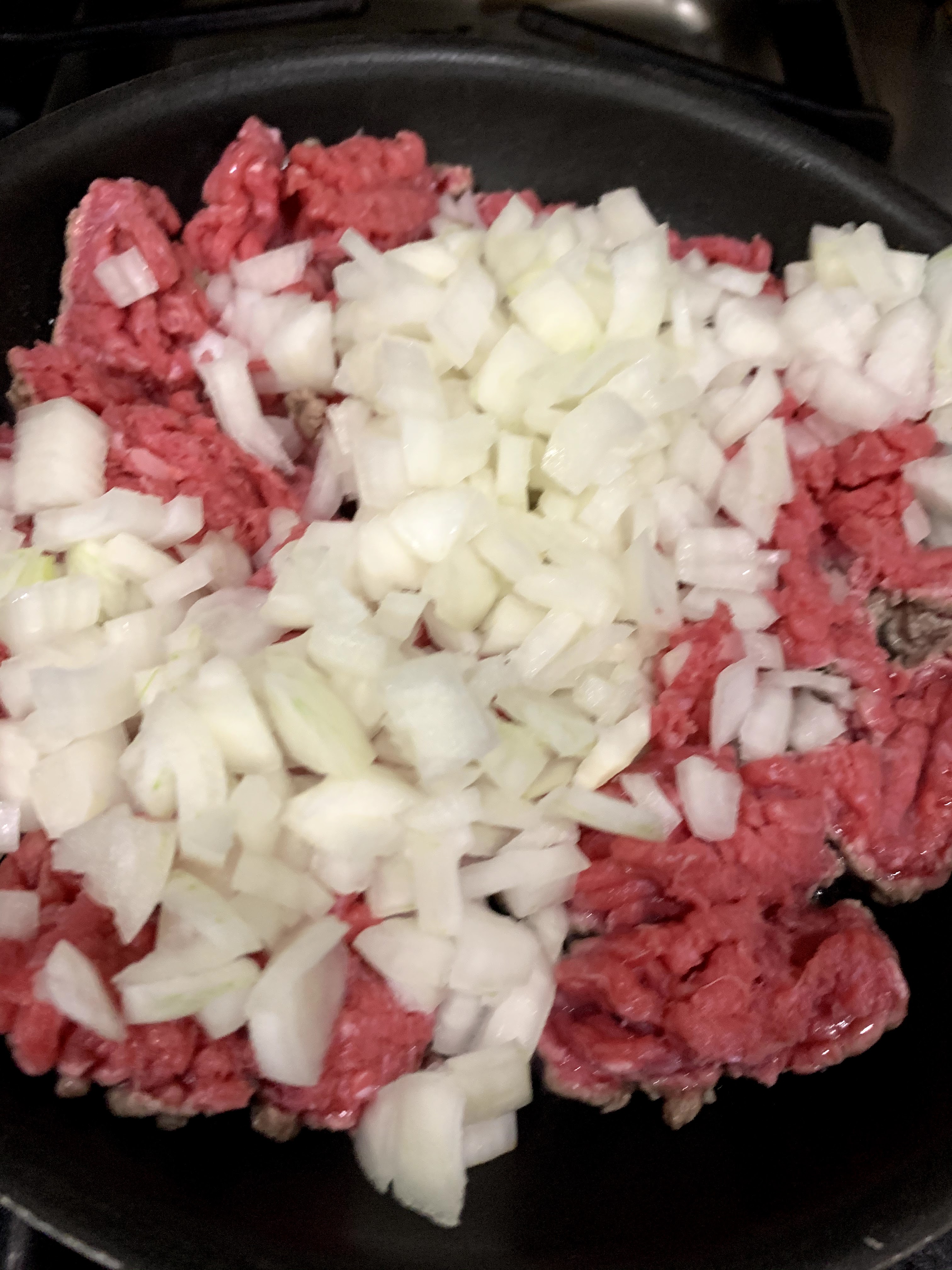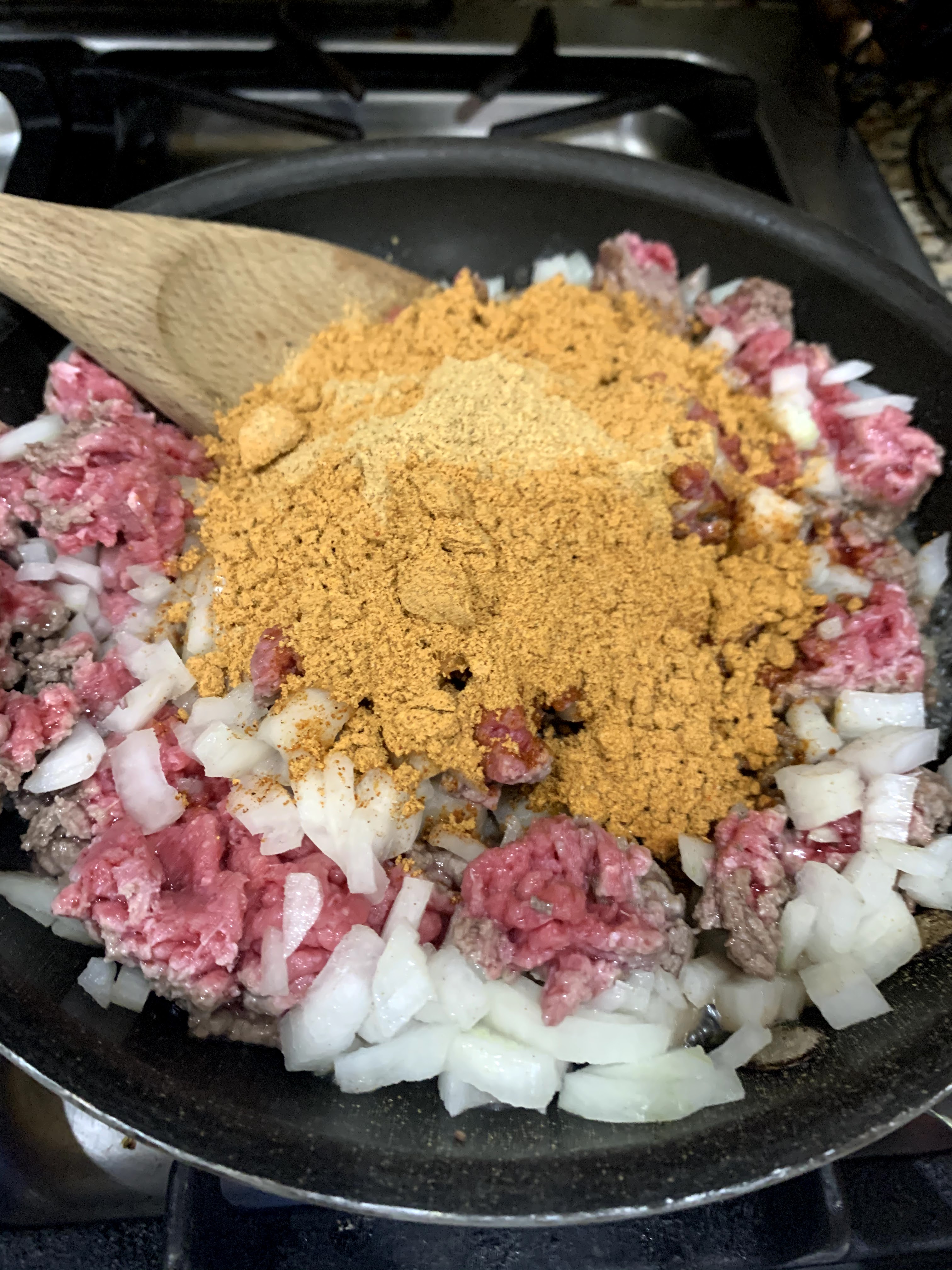 - Add ground beef, onions, and taco seasoning into skillet and brown over medium high heat.