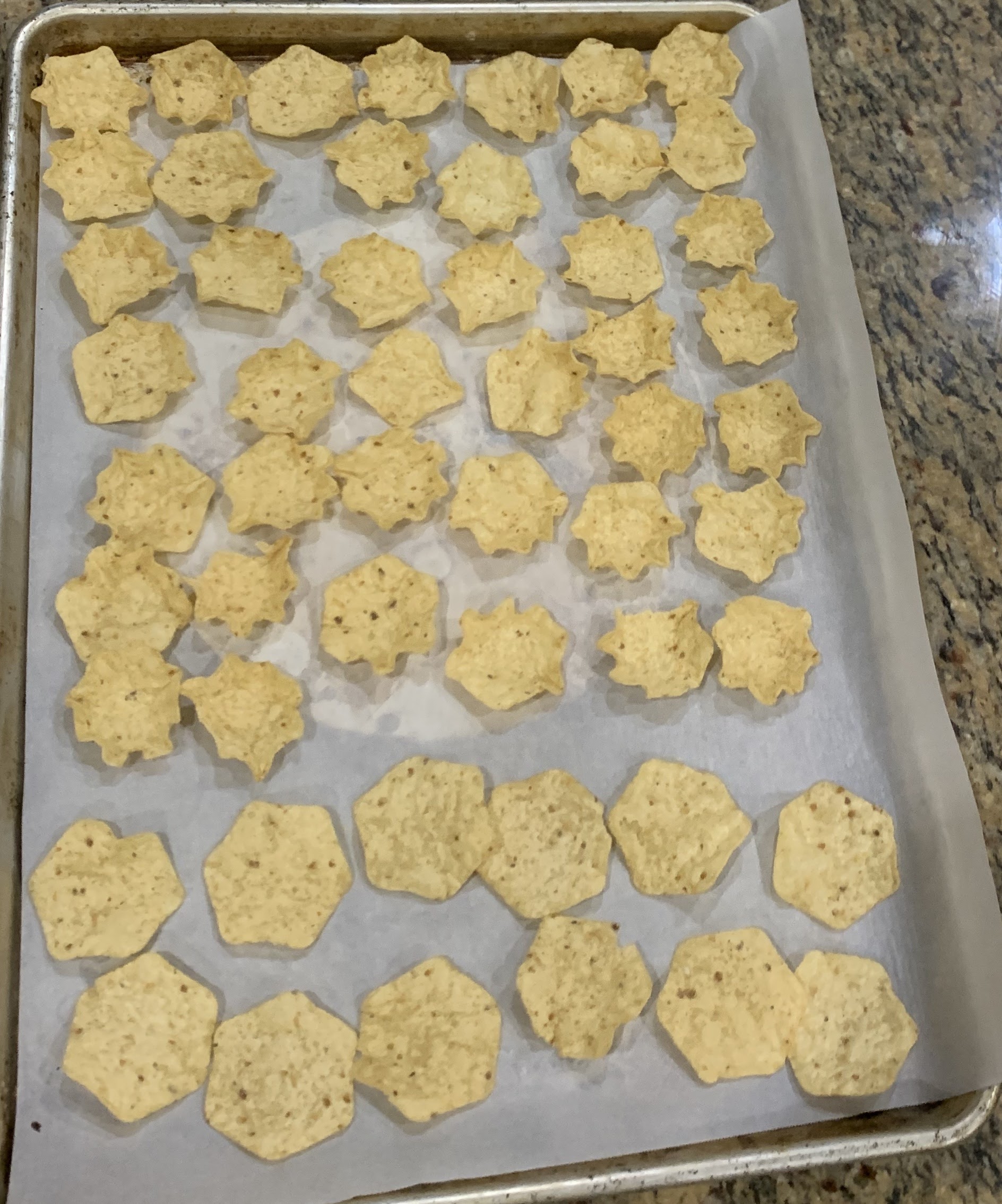 - Lay out unbroken scoop tortilla chips on a parchment paper cover baking sheet.