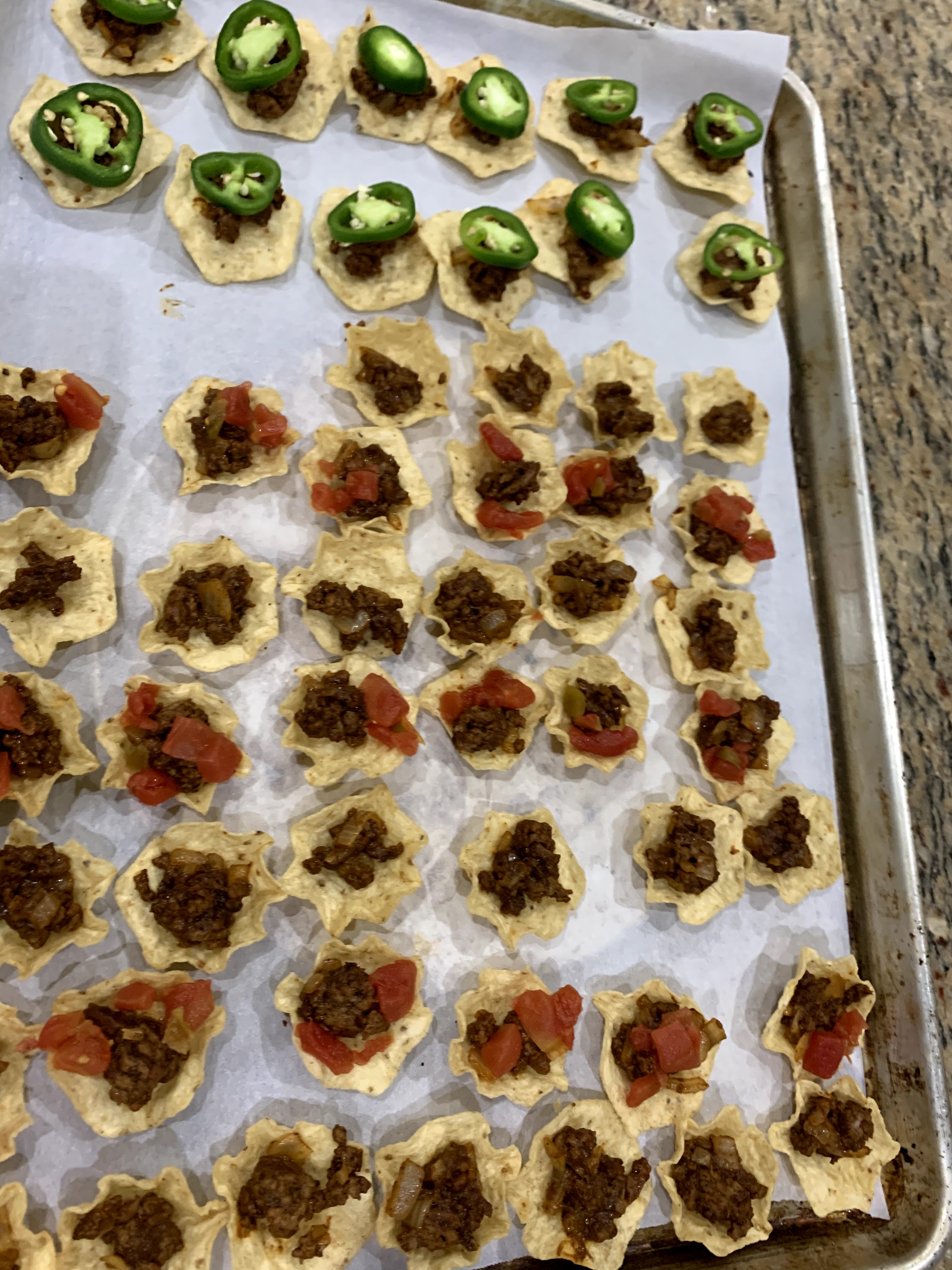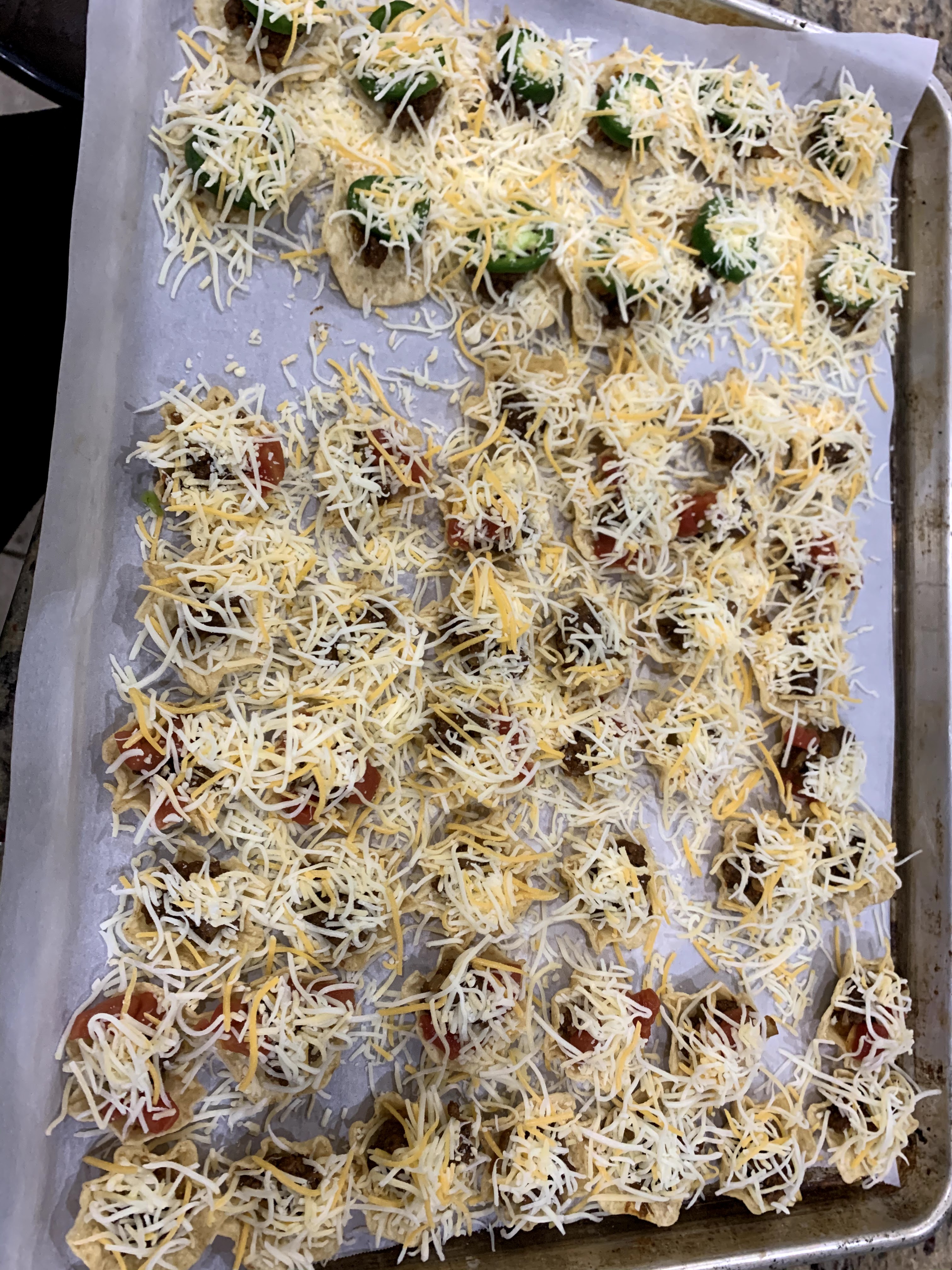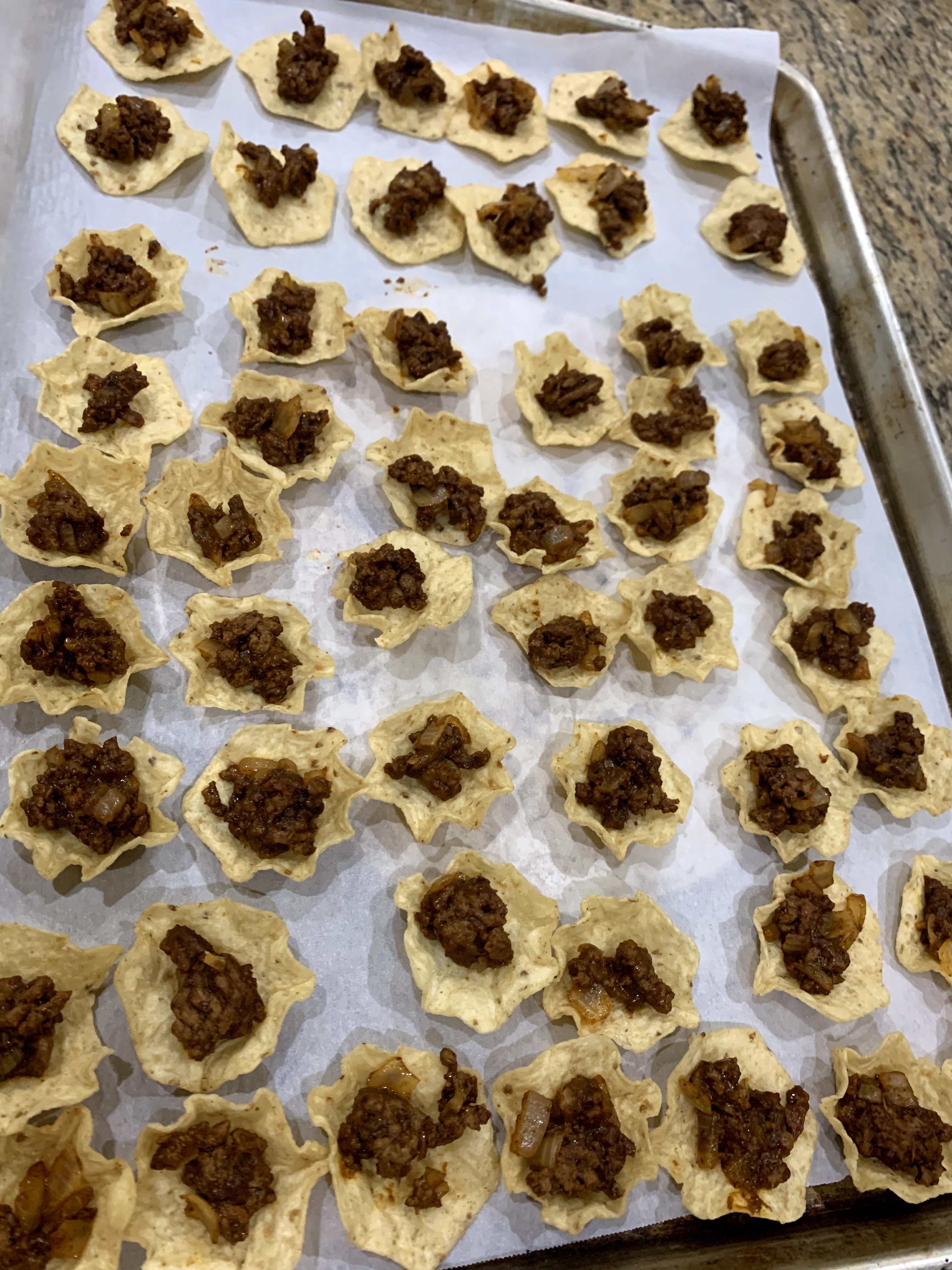 Once you have your meat browned, you will then move onto the layering step. To begin this step you will need to cover a baking sheet with parchment paper. You will add the tortilla scoops, making a single layer on the baking sheet.