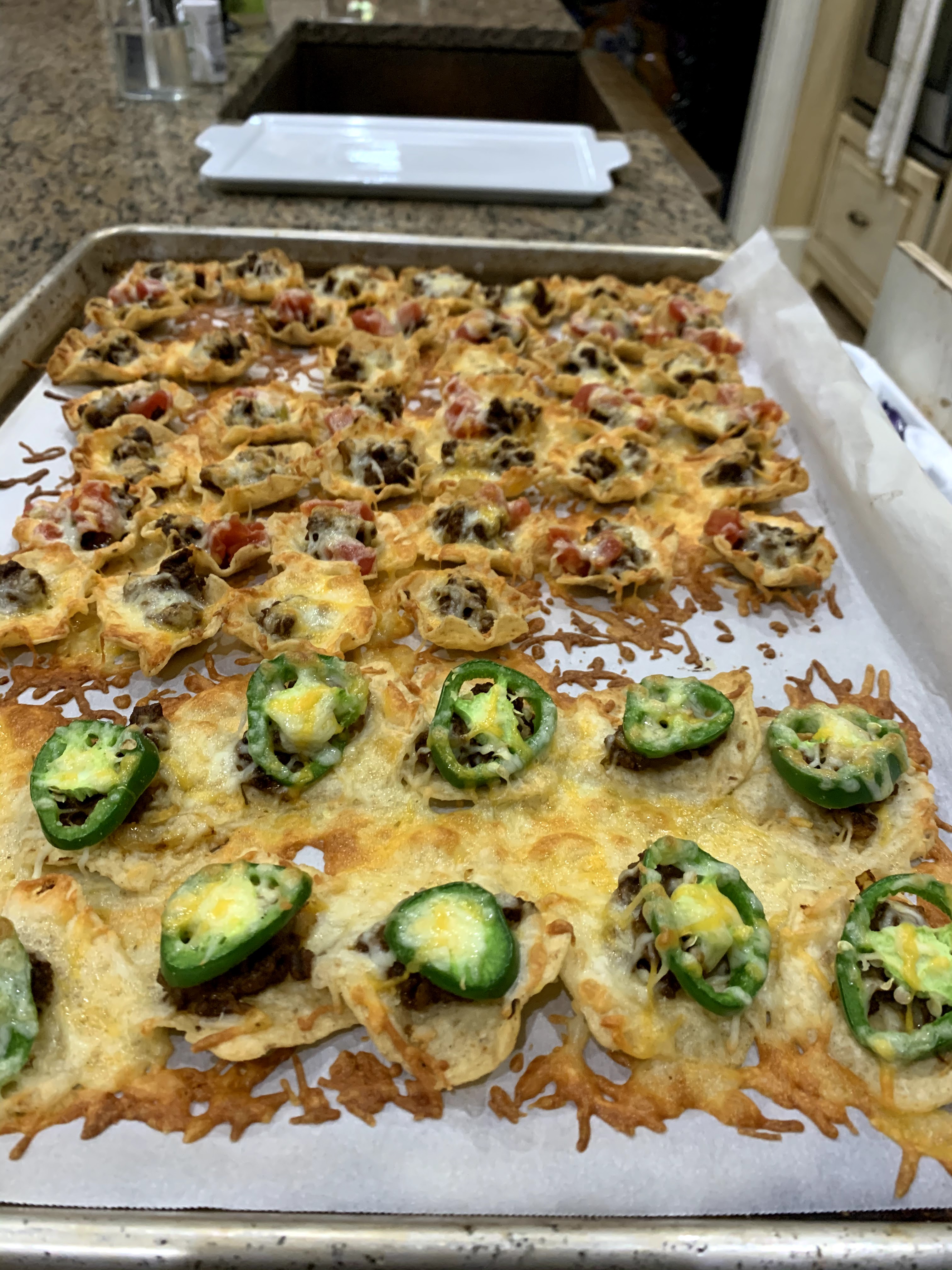 - Turn on over broiler to 450 degrees and finish the taco bites under the boiler for 6 minutes or until the cheese is golden brown, keeping a close eye on them to make sure they do not burn.