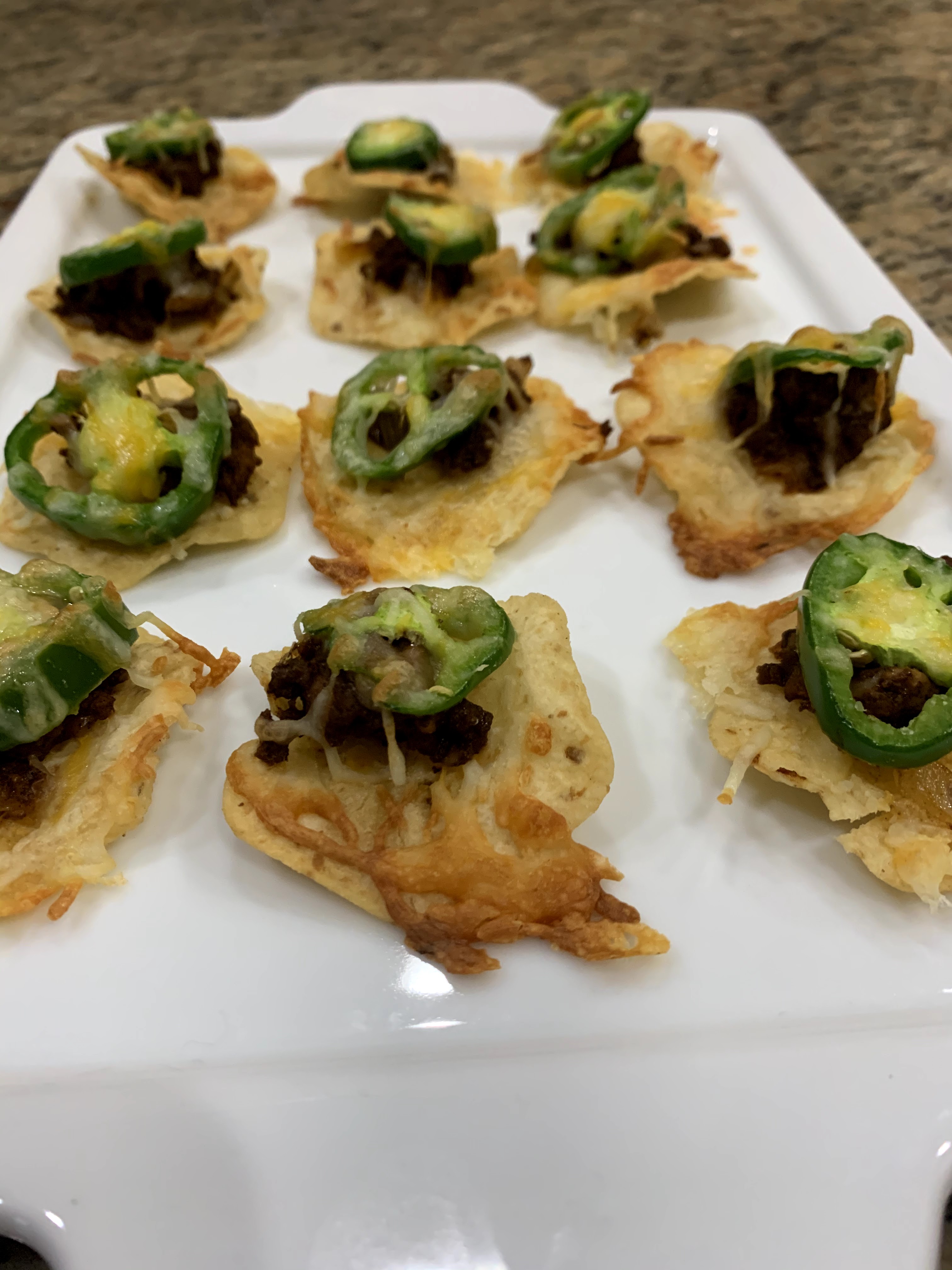 You will then add a small bit of the meat mixture to each cup. On top the the meat mixture, will be the Rotel. If you are adding jalapenos, they go on third. Once all your layers are added, you will then cover it all with the whole bag of cheese. Do not be stingy with the cheese. I am a firm believer that there is no such thing as too much cheese!!!