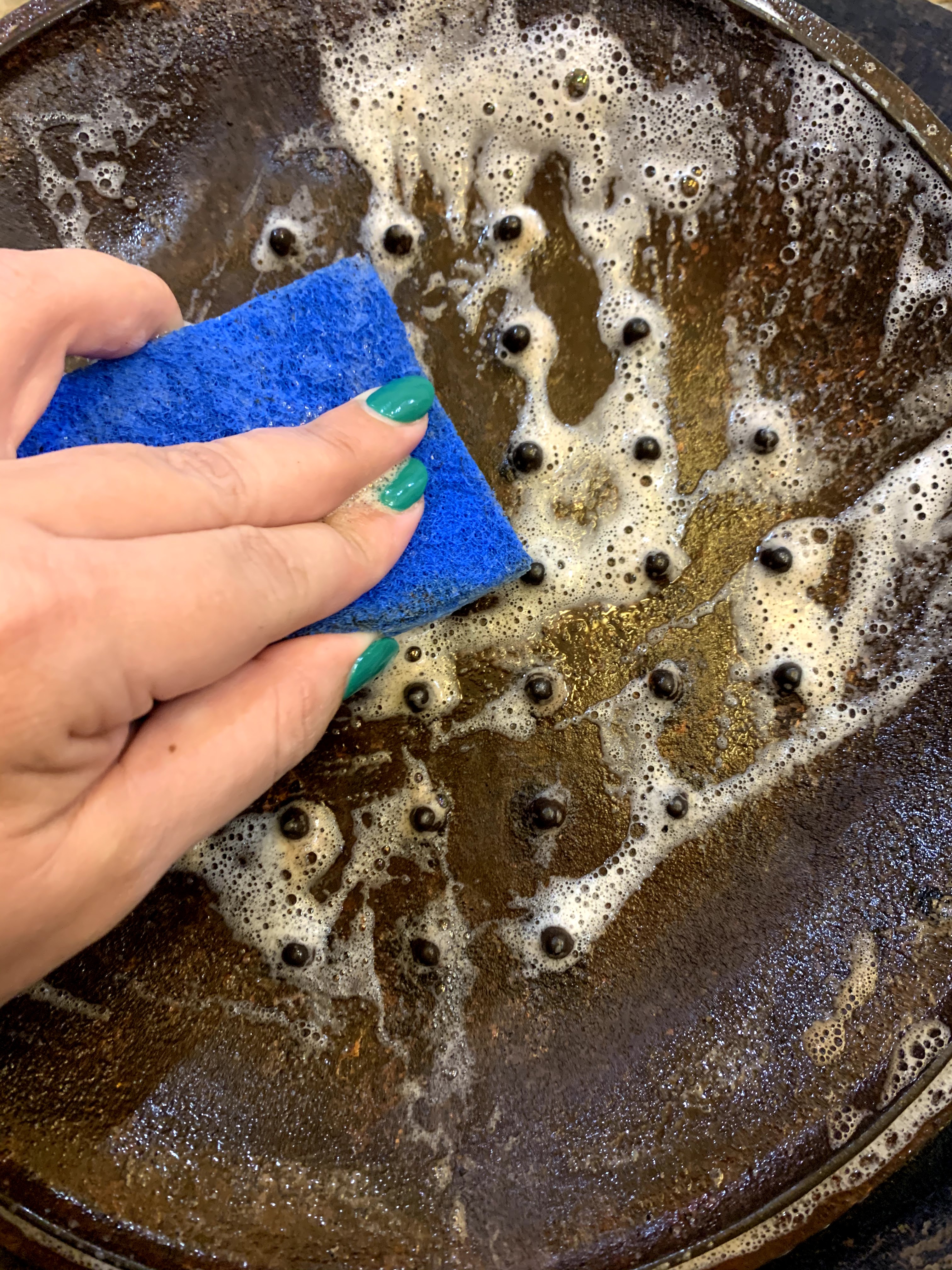 Wash the skillet with warm, soapy water with the sponge or brush. If the cast iron is rusty use the steel wool pad. Normally you would not wash the cast iron with with soap, but since we are about to reseason it, it will be fine.