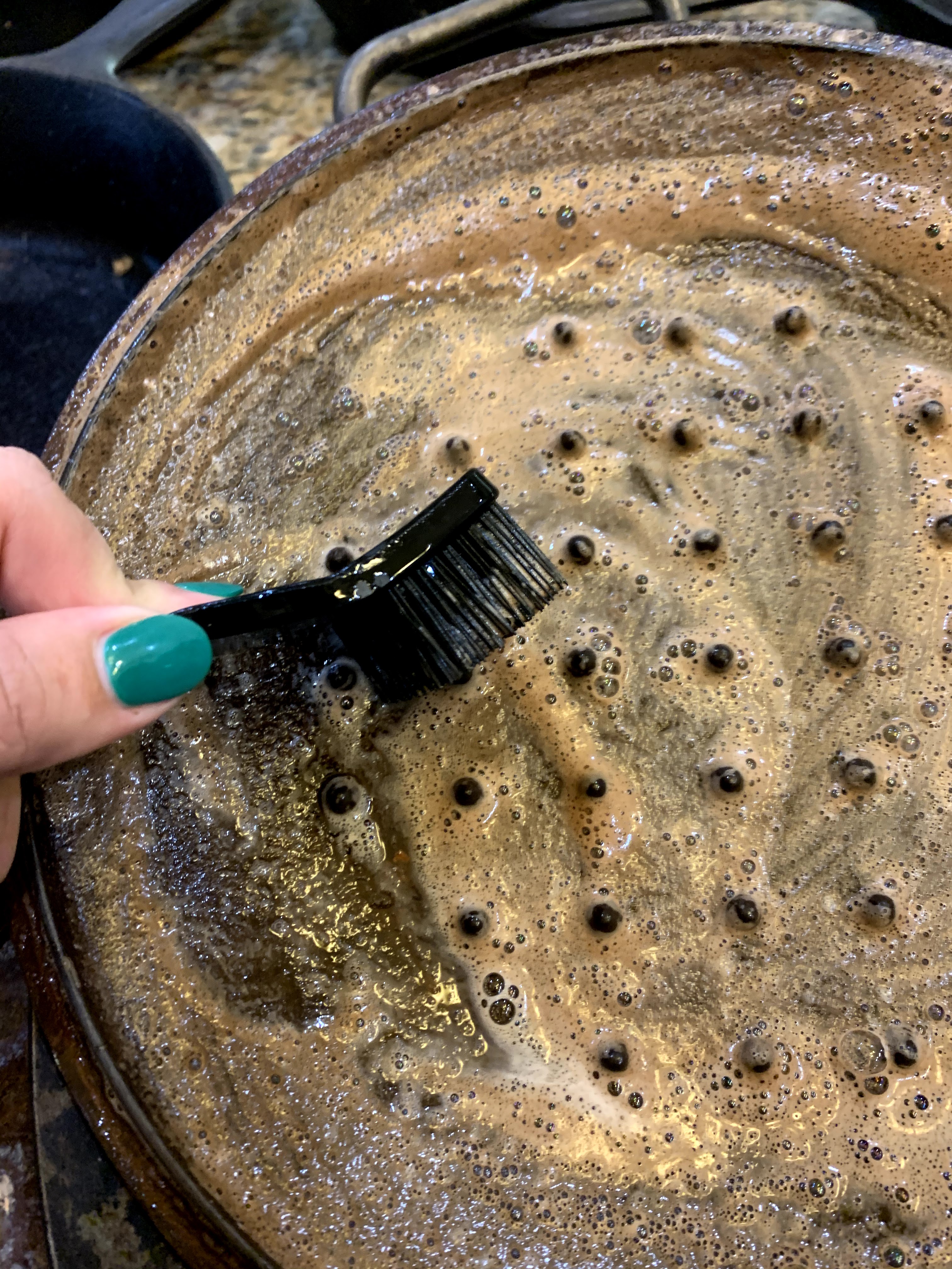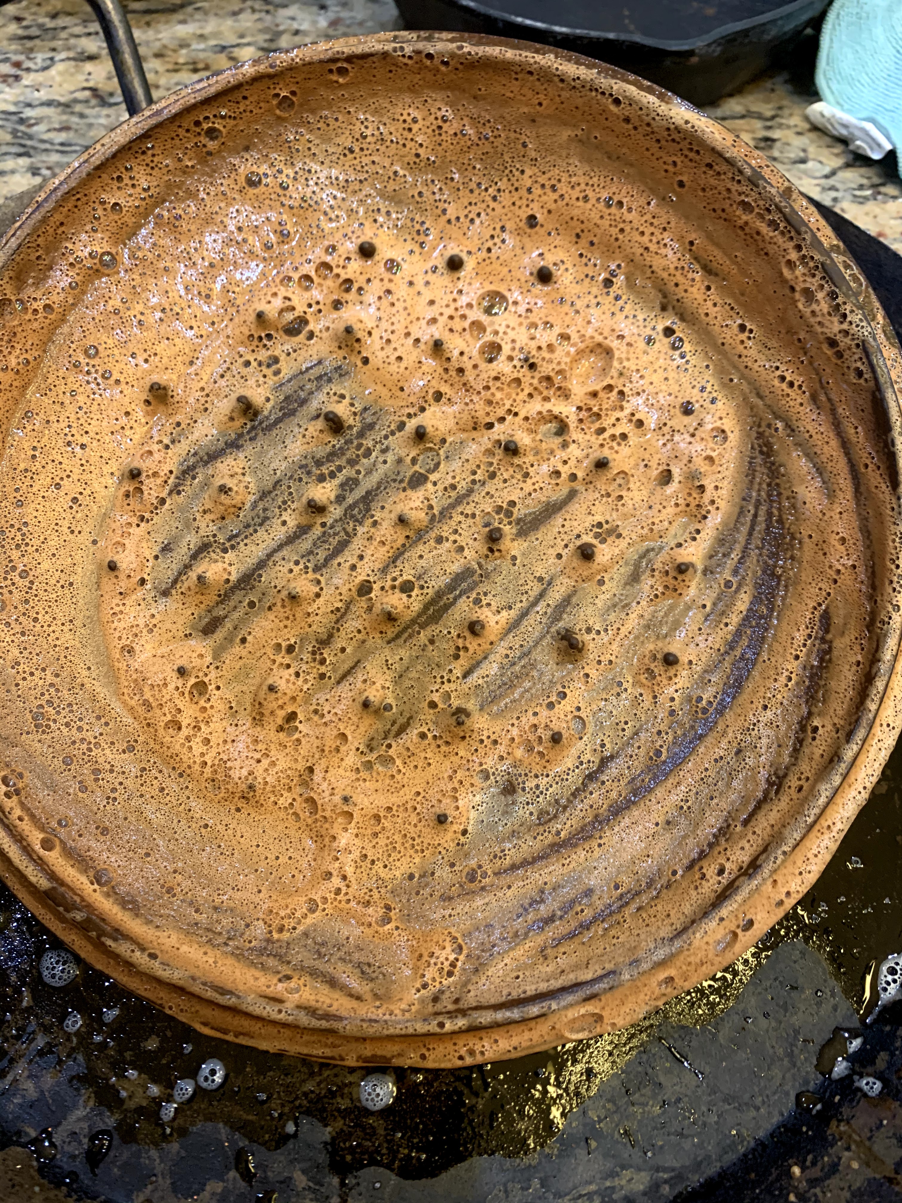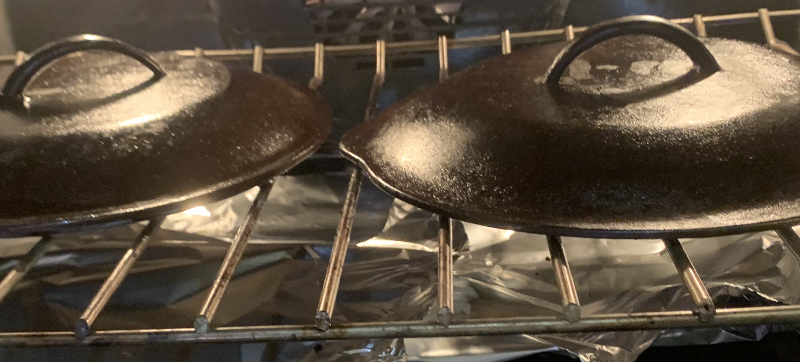 Flip the skillet over and oil the outside and bottom of the skillet too. You want a thin coat of oil coating the whole skillet.